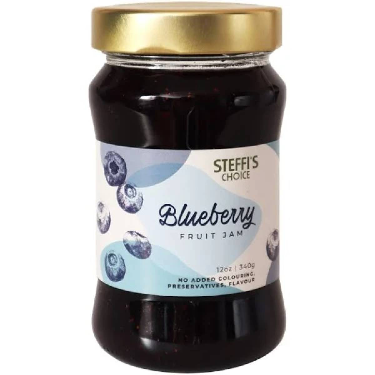 STEFFIS CHOICE Blueberry Jam 340 g is a smooth and fruity spread made from real blueberries, delivering a rich, natural blueberry flavour with every spoonful. Its velvety texture makes it easy to spread on toast, pancakes, or pastries, while the sweet-tart balance highlights the authentic taste of fresh blueberries. Perfect for breakfast, baking, or dessert toppings, this jam brings a delightful fruity touch to any meal.