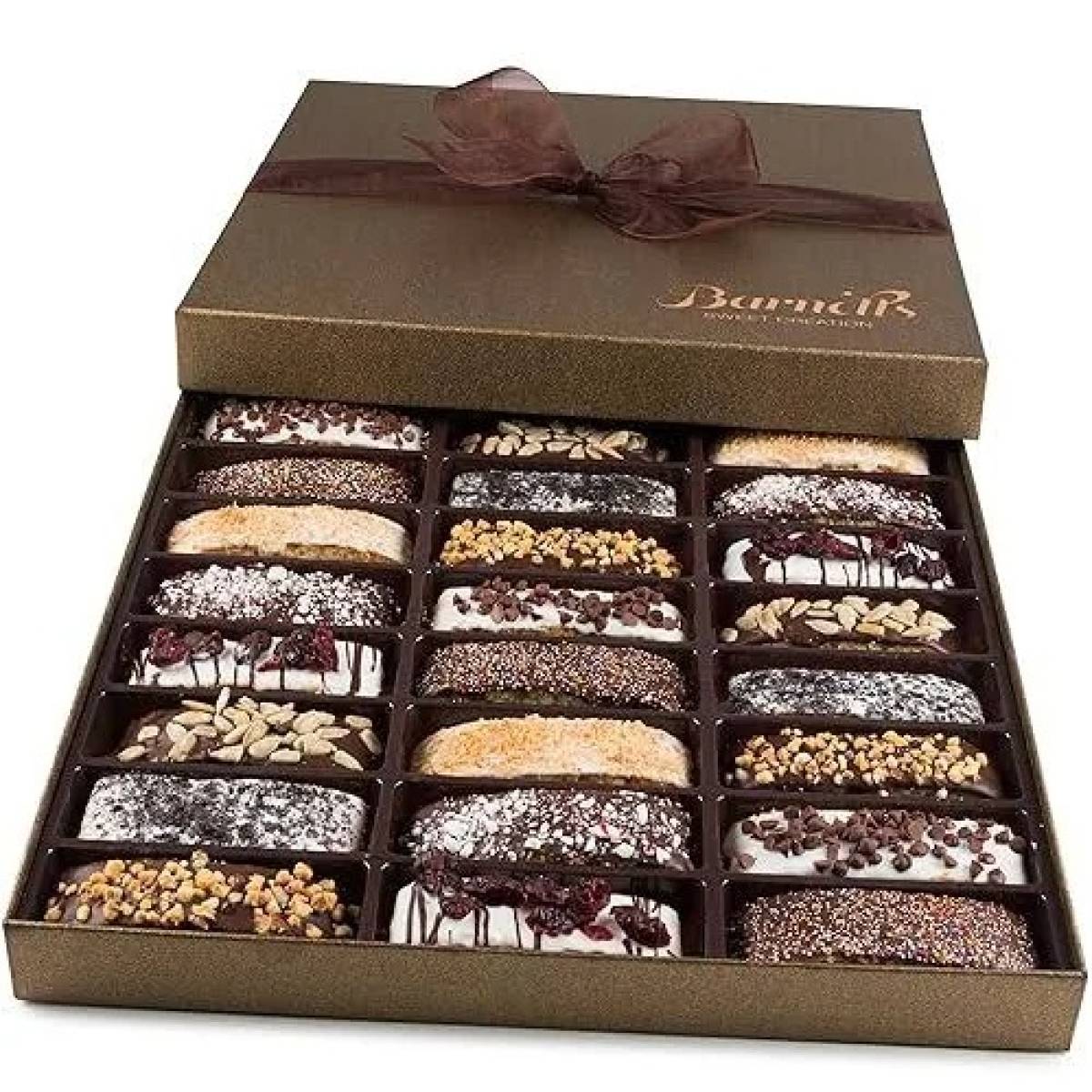 A luxury gifting box featuring gourmet, handmade Italian biscotti. Unlike traditional plain biscotti, Barnett's version is more like a "confectionery cookie"—twice-baked for a perfect crunch, then generously hand-dipped in premium dark chocolate and finished with various crunchy toppings (nuts, caramel, coconut). They are designed specifically as elegant gifts for corporate events, holidays, or birthdays.