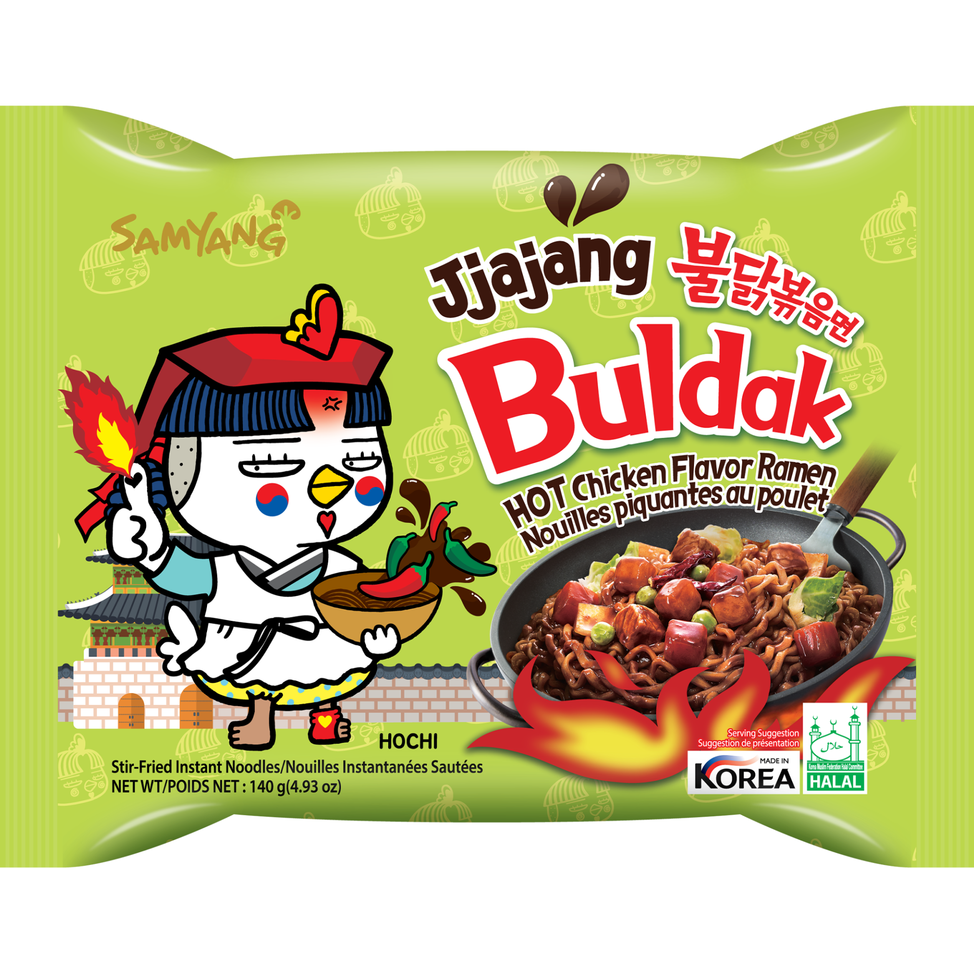 A unique fusion flavor that combines the famous spicy "Buldak" sauce with the savory sweetness of "Jjajang" (Korean Black Bean Sauce). It is a "soup-less" dry noodle dish that offers a rich, dark, and glossy coating on the noodles. The taste is a complex balance of the earthy, slightly sweet black bean paste and the signature fiery chicken kick.